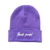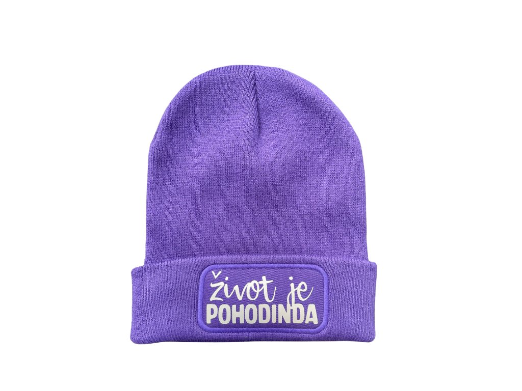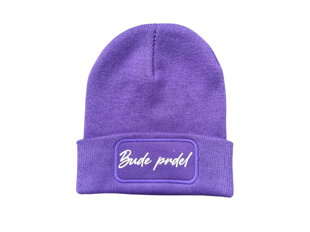 Minimalistická pletená čepice ve fialové barvě s výrazným potiskem jako je např. bude prdel nebo život je pohodinda