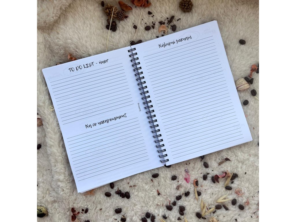 Každý týden má svůj přehledný prostor pro zápisky, poznámky i to-do listy. Díky praktické kroužkové vazbě se diář pohodlně otevírá a psaní je radost.