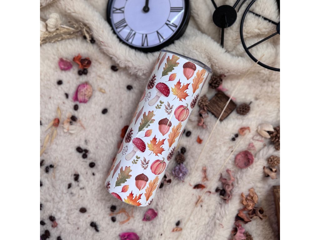 🎃🍄 Podzimní termo kelímek s motivem dýní, listů a hub – Udržte svůj nápoj ☕ teplý nebo studený 🧊 a užijte si kouzlo podzimu 🍂 na každém doušku. Ideální společník na procházky, do práce i na cestování 🚶♀️🍁.