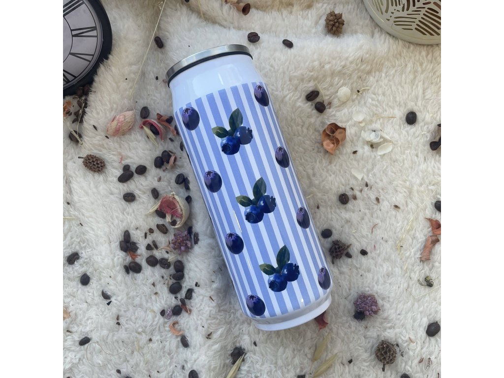 Tato termoplechovka ve tvaru plechovky zaujme jemným modro-bílým proužkovaným designem doplněným o decentní borůvkový motiv. Působí klidně, svěže a nadčasově – ideální volba pro milovníky minimalistického stylu a přírodních tónů.